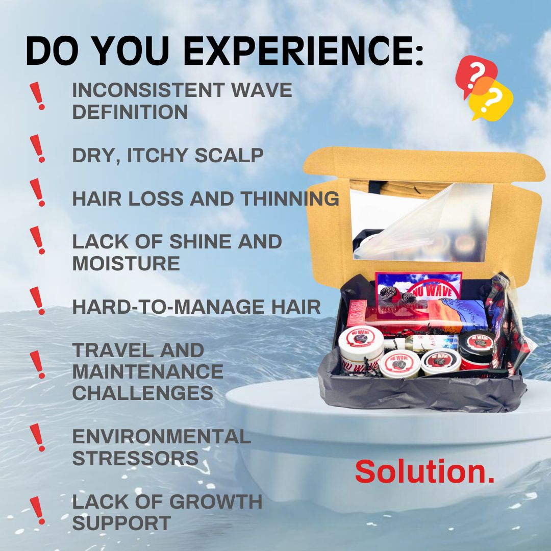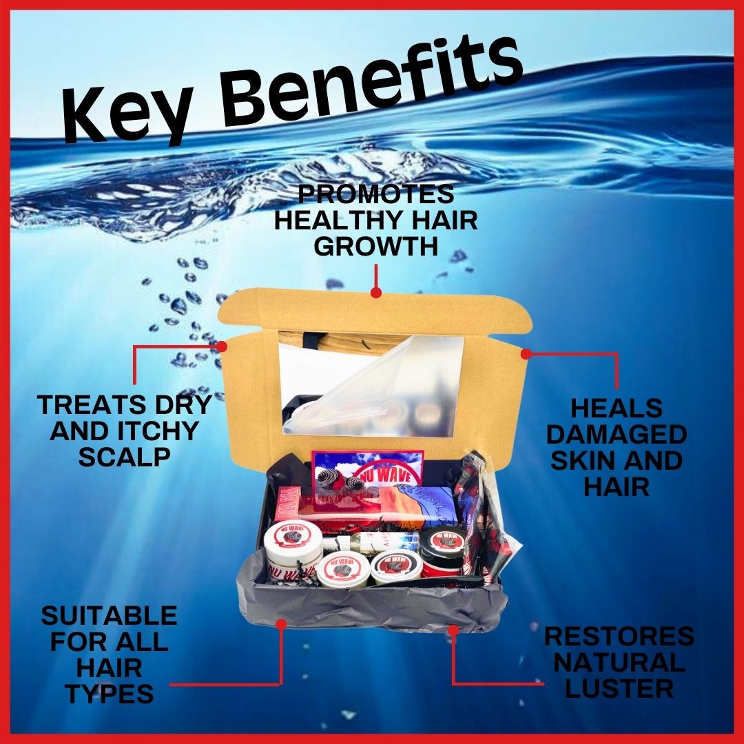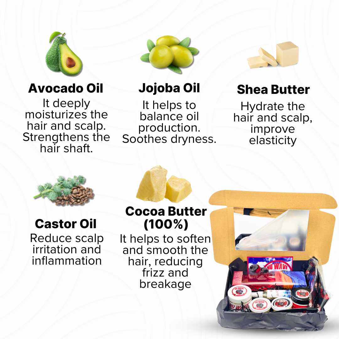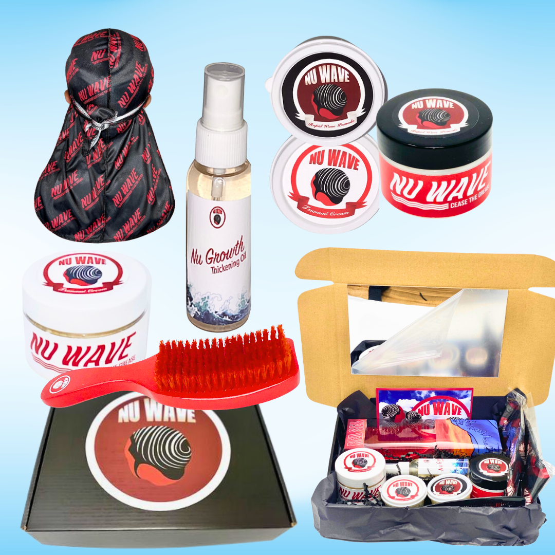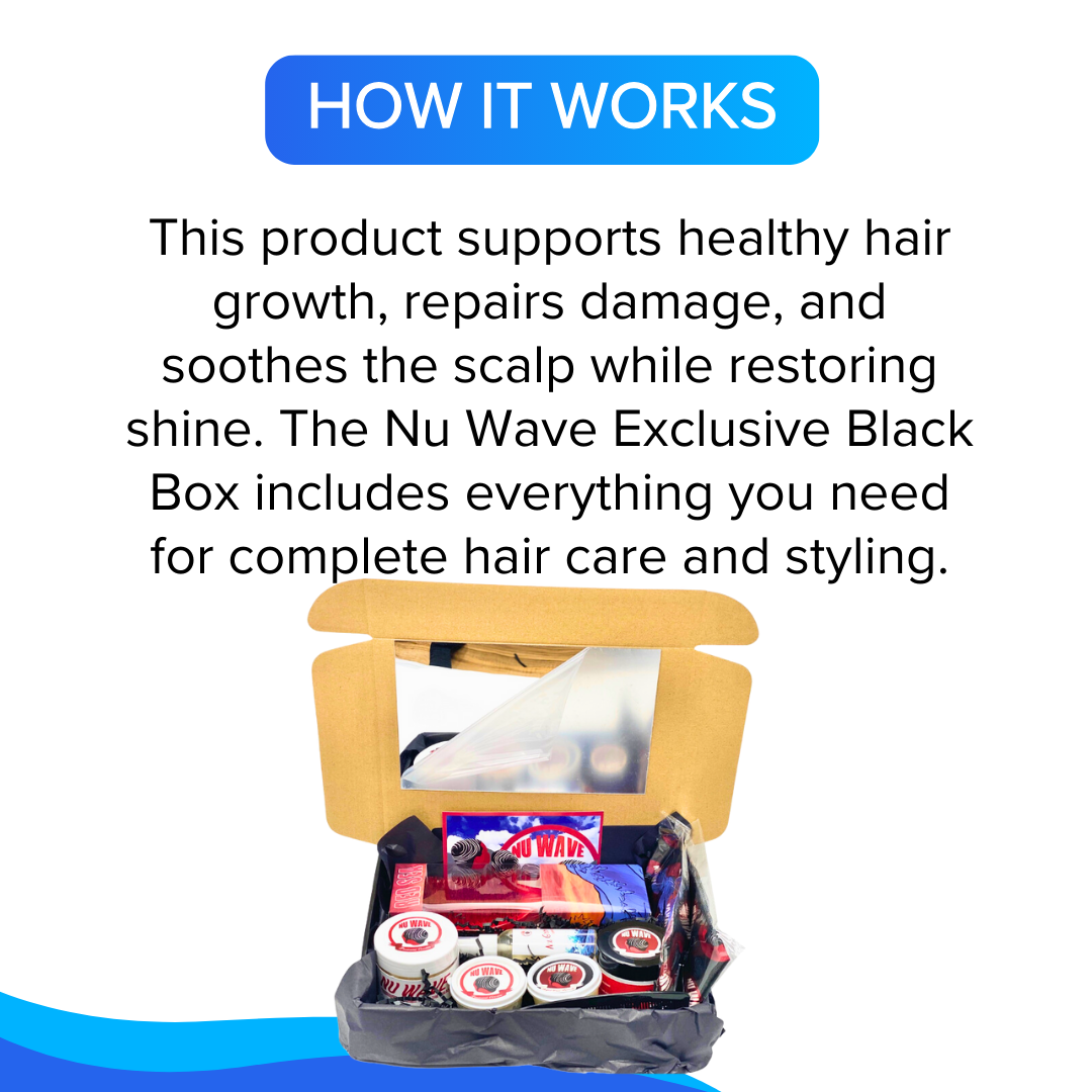 The Nu Wave Exclusive Black Box Deluxe Kit is a comprehensive wave box set for serious beginners, advanced wavers, or those looking for maintenance set. Designed as a complete set so great for beginners or advanced wavers. It is the ultimate gift box for nephews, brothers, friends, and fathers who want to start waving or those who are already waving. It has an instruction card to guide beginners. It includes a variety of high-quality products and tools to enhance wave patterns and improve hair health.