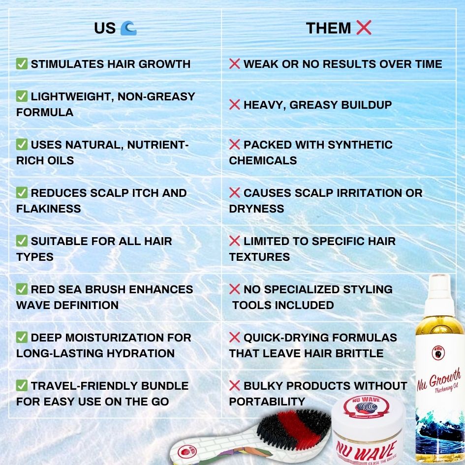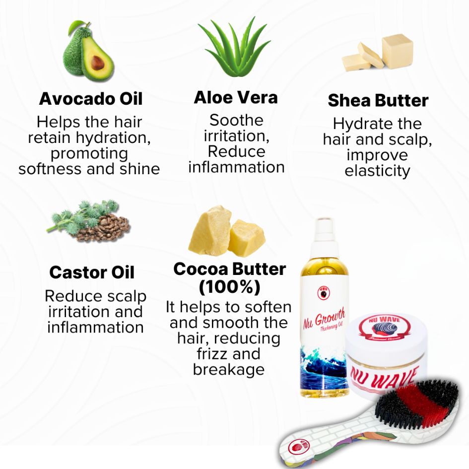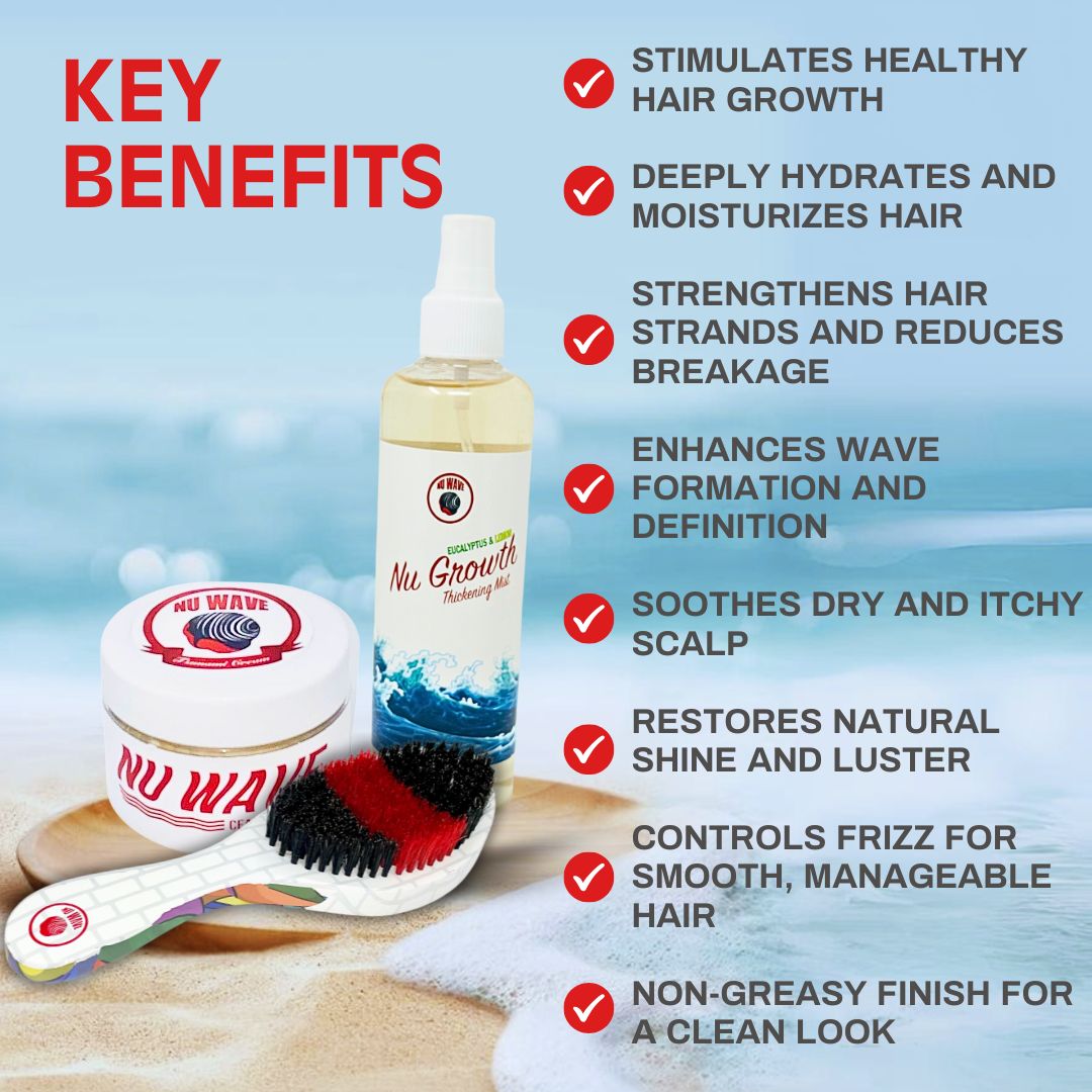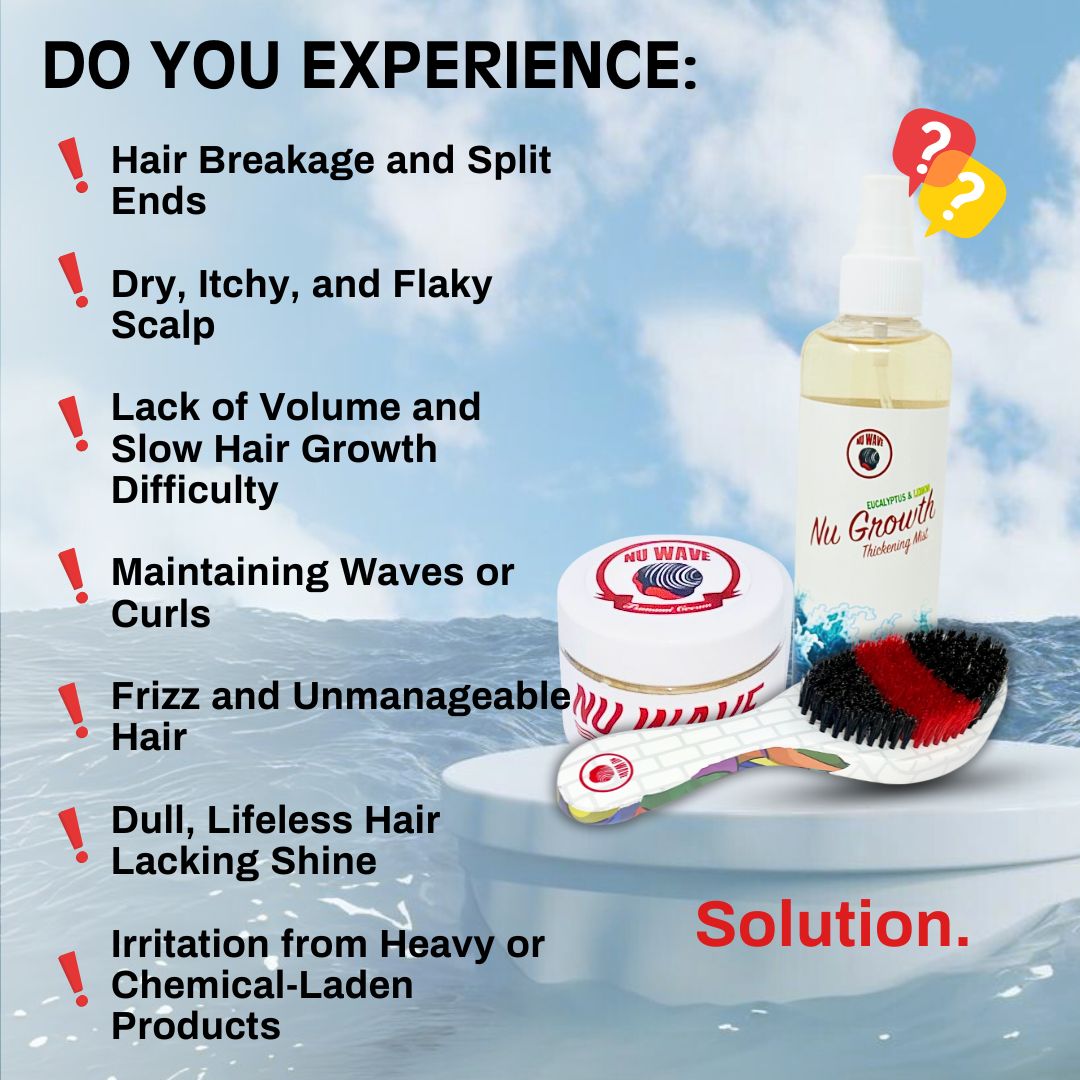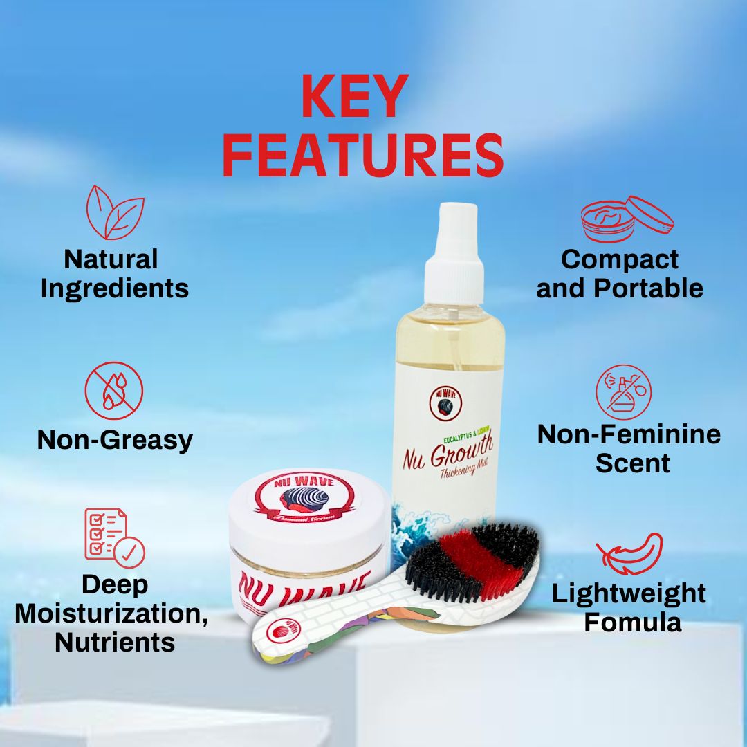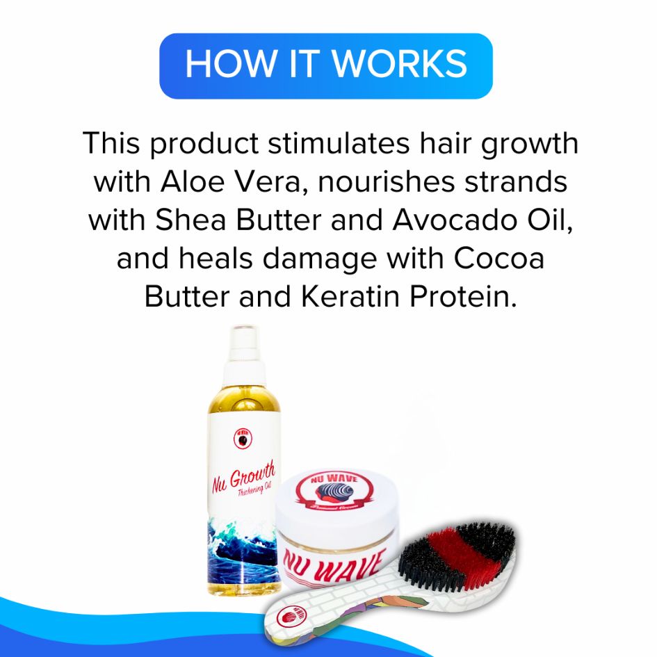 For best results, use the Tsunami Cream Moisturizer and Nu Growth Thickening Oil daily or as needed. The Red Sea Brush should be used regularly to style your hair and distribute oils.