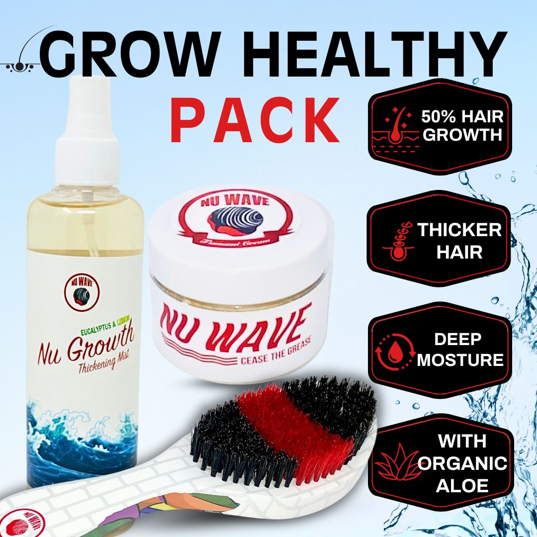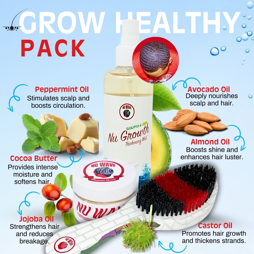 The Grow Healthy Pack is a curated set of hair care products including a moisturizer, a growth-promoting oil, and a medium/hard brush, designed to improve hair health and promote growth.