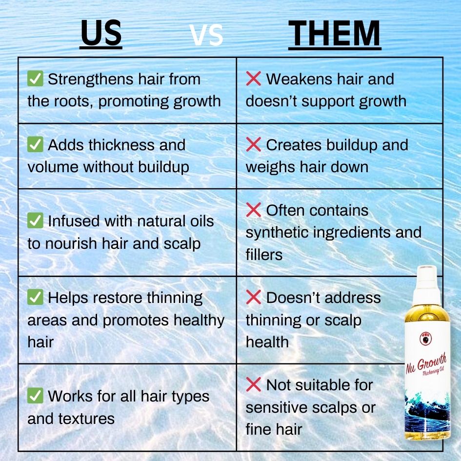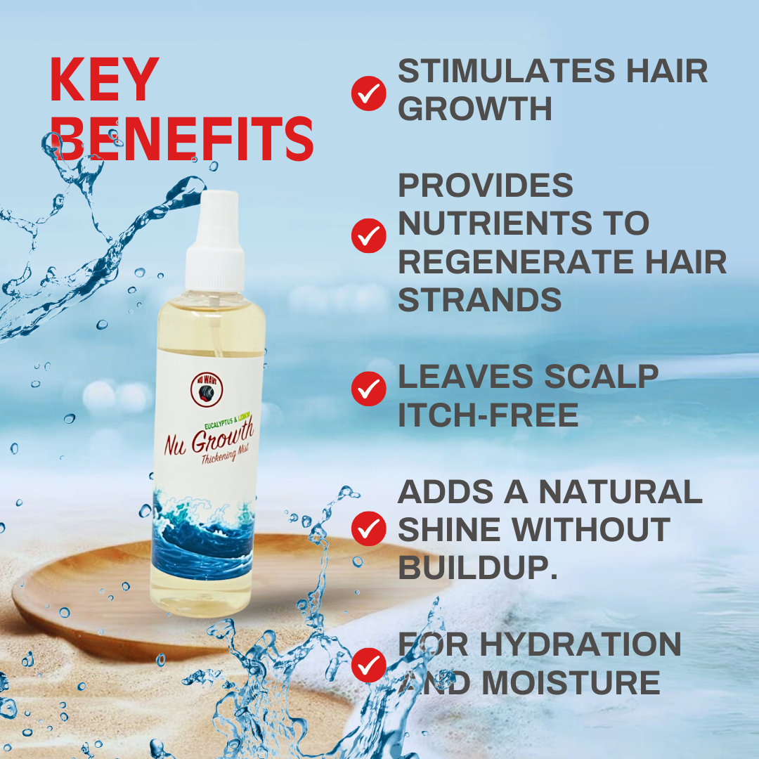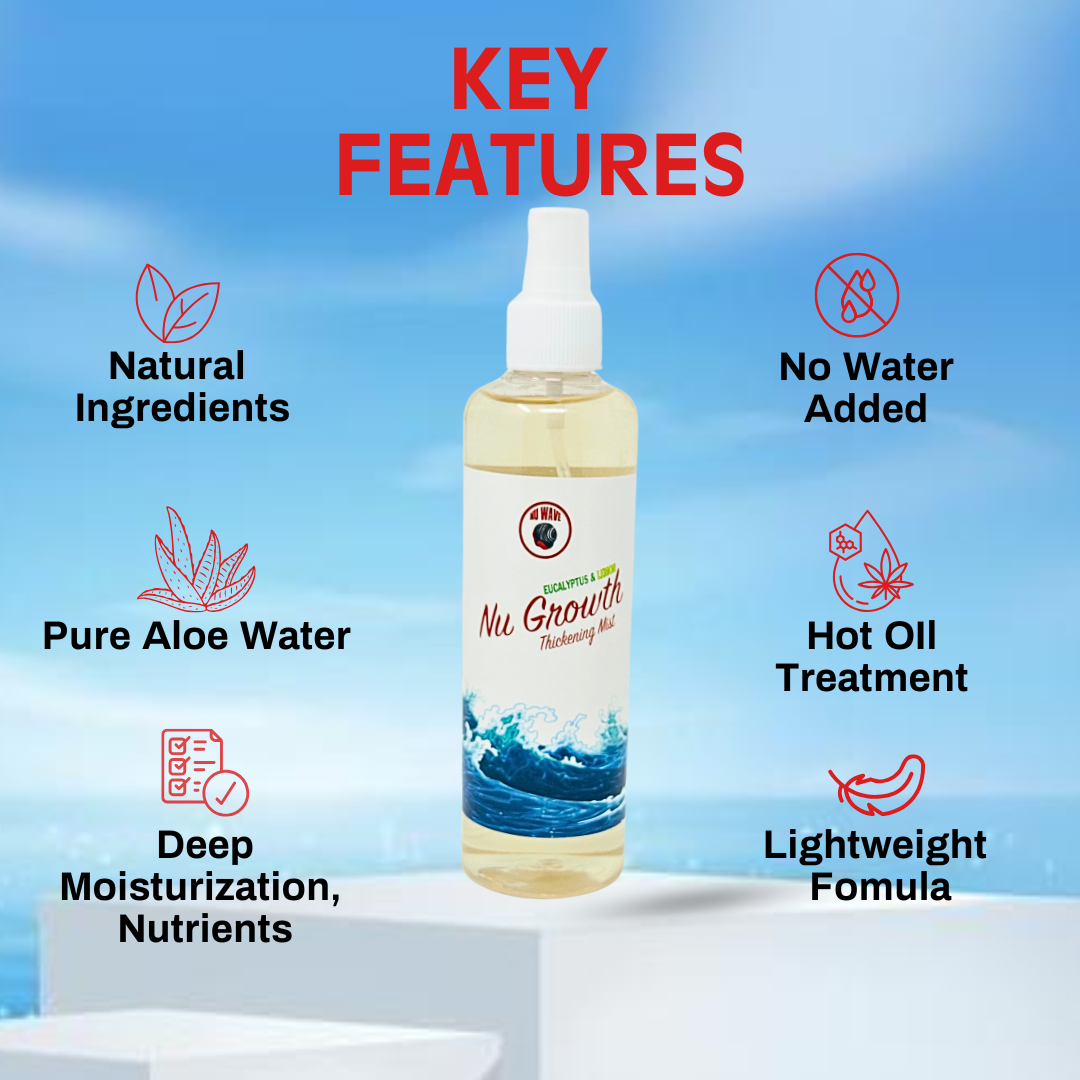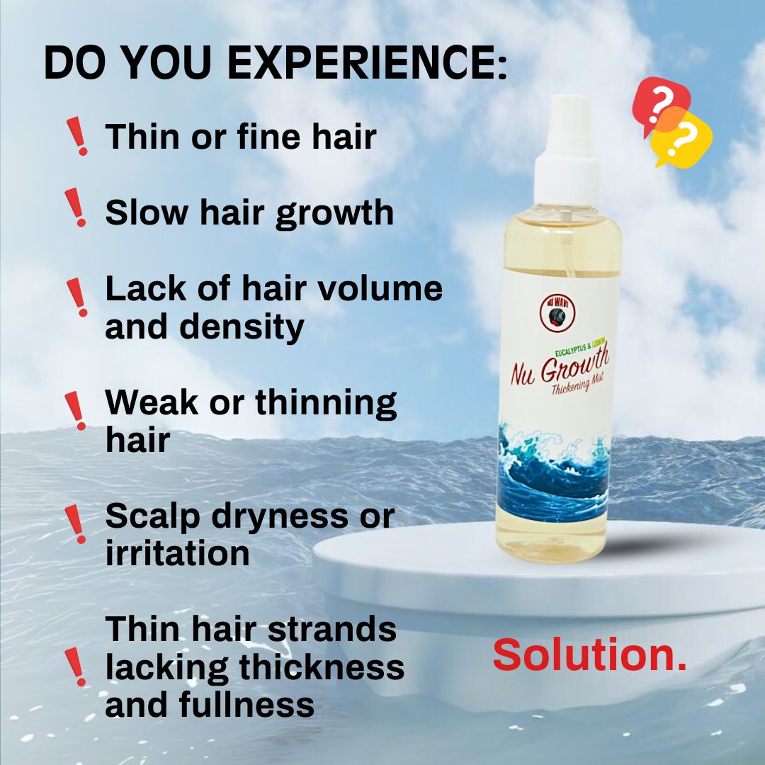 Nu Growth Thickening Mist (formerly Nu Growth Thickening Oil) was formulated to penetrate the scalp and treat your hair follicles at the root. Stimulating hair growth, providing nutrients to regenerate hair strands in thinning areas. This product is very light and will leave your scalp itch free. 8oz