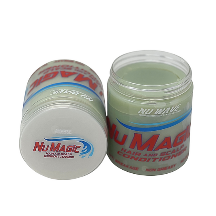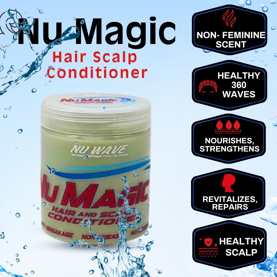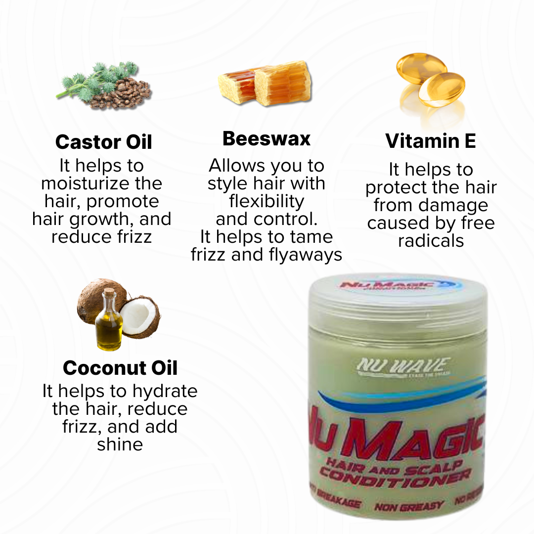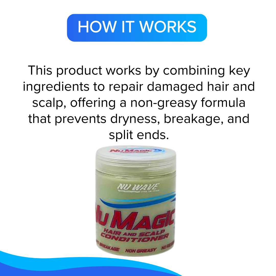 Nu Magic Hair and Scalp Conditioner is a hair care product designed to nourish and moisturize both the hair and scalp. It's formulated with natural ingredients like lanolin, beeswax, and shea butter to help repair damaged hair, reduce frizz, and leave hair soft, manageable, and shiny.