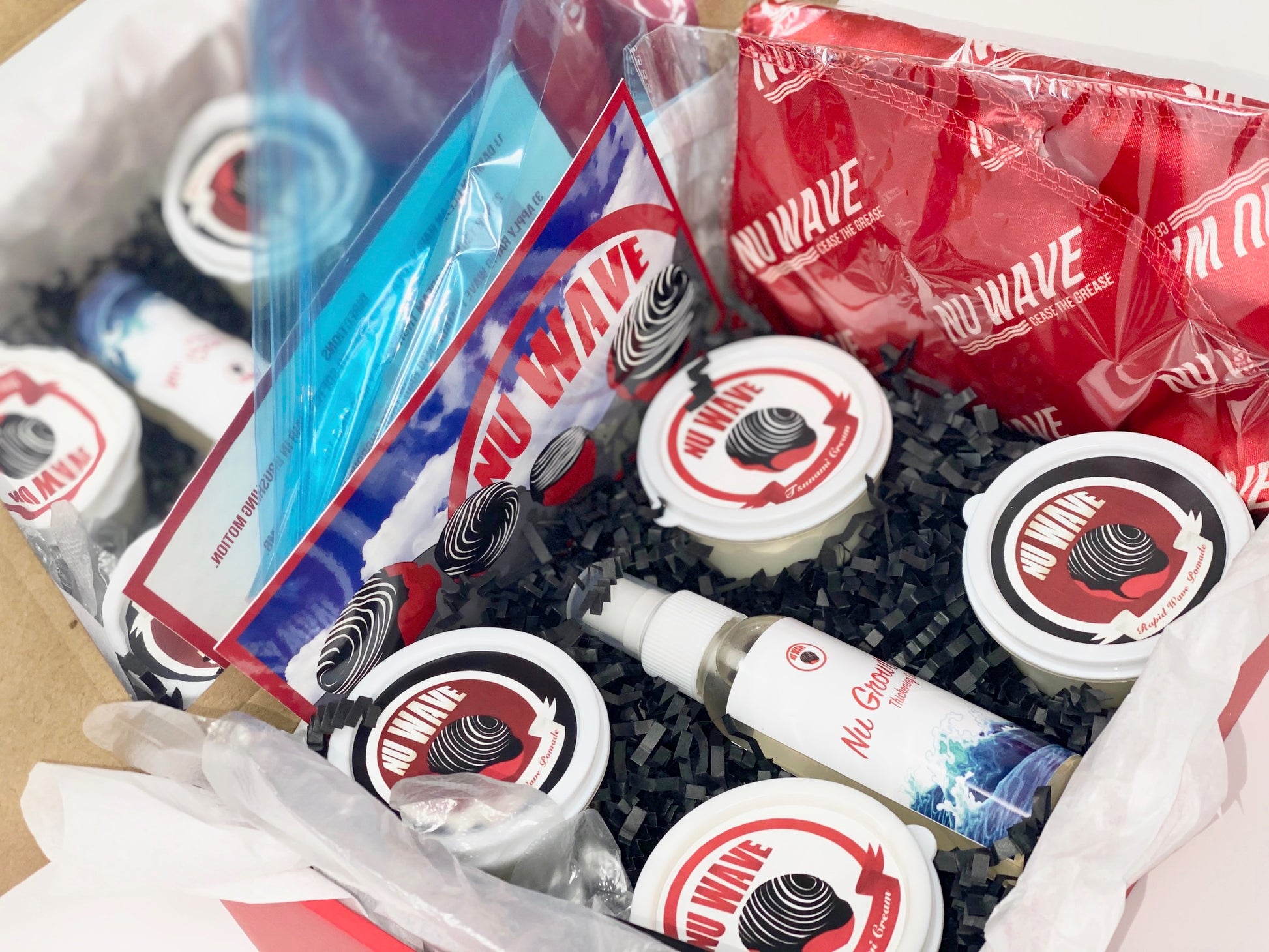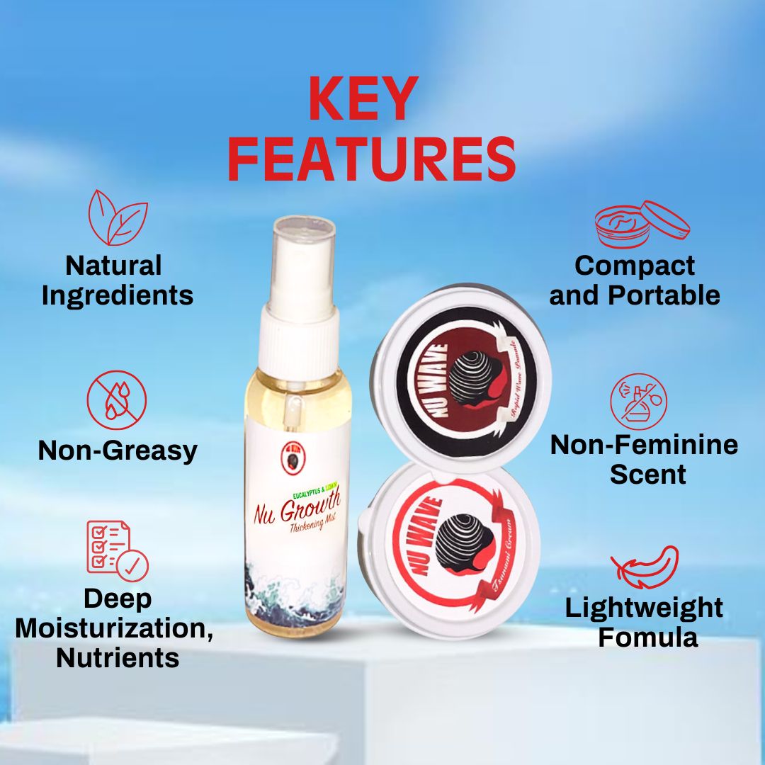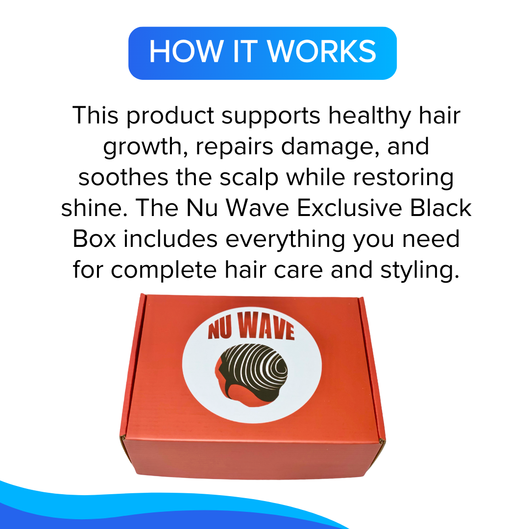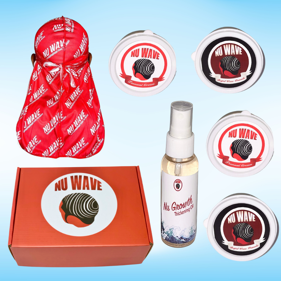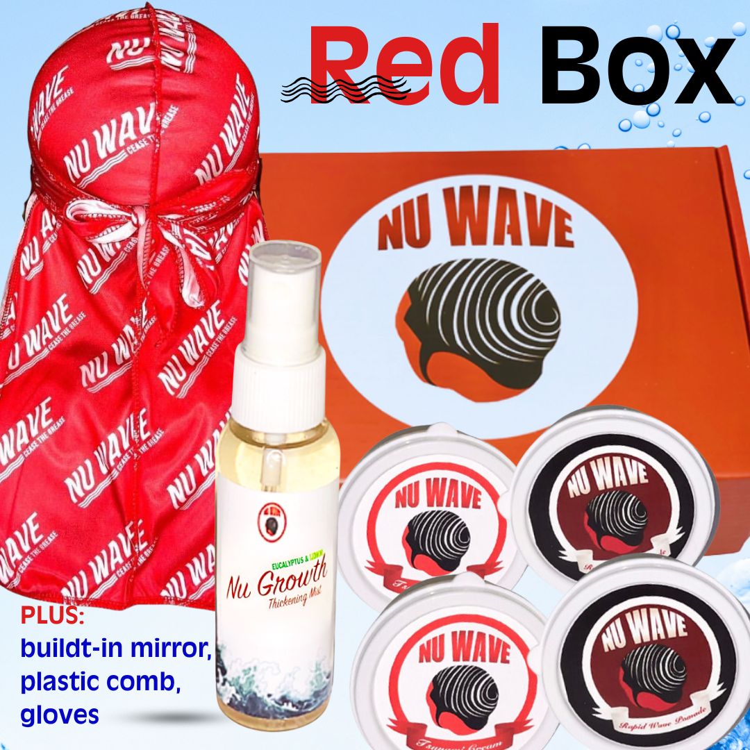 The Nu Wave Red Box Waving Kit is a comprehensive set designed specifically for those on-the- go wavers because it comes with handy containers, also designed for those starting their wave journey or transitioning to natural hair. This is the ultimate gift that you can give to friends, brothers, nephews, and fathers who want to start waving or are always on the road wavers. It includes a mirror and a range of products and accessories aimed at improving hair health and enhancing the wave styling process.