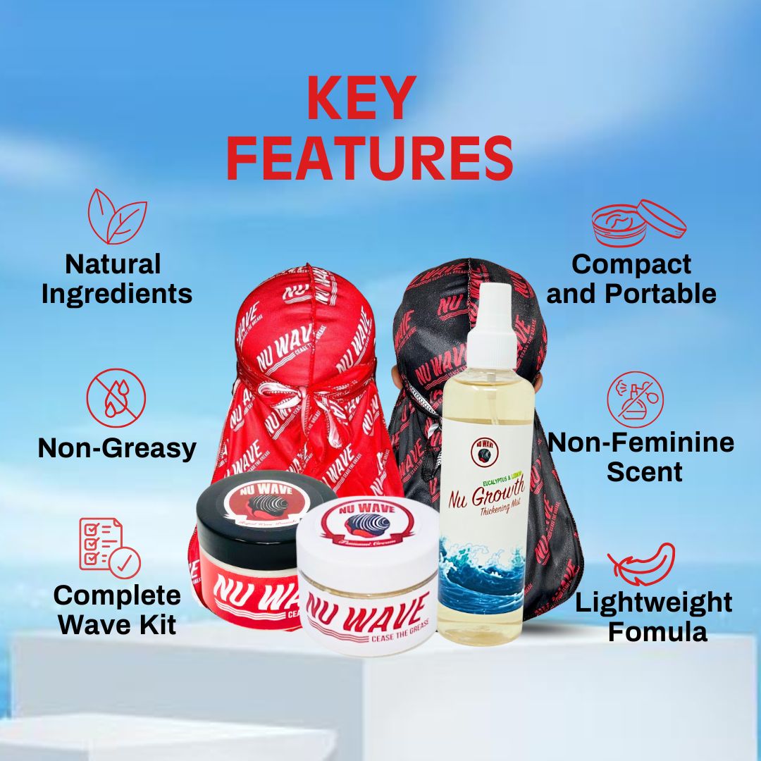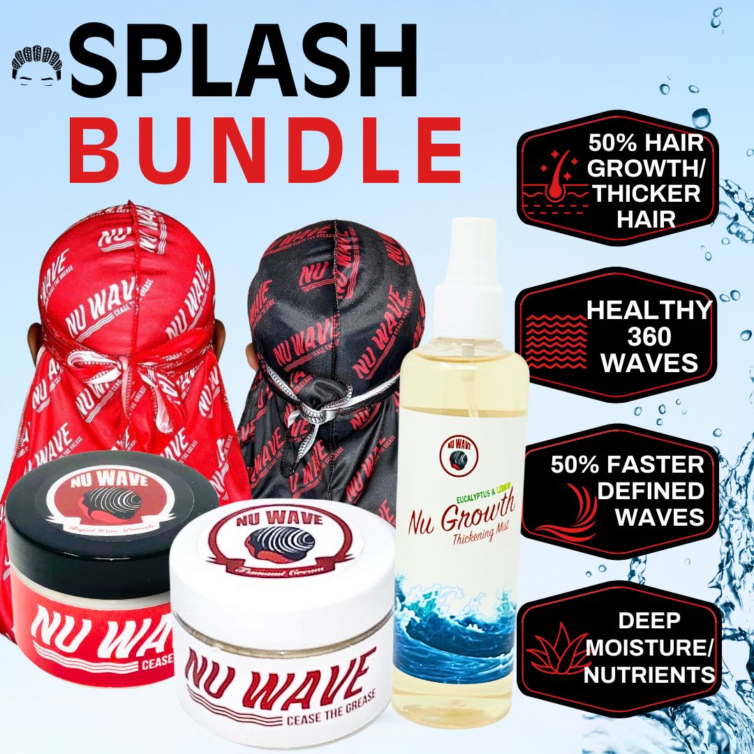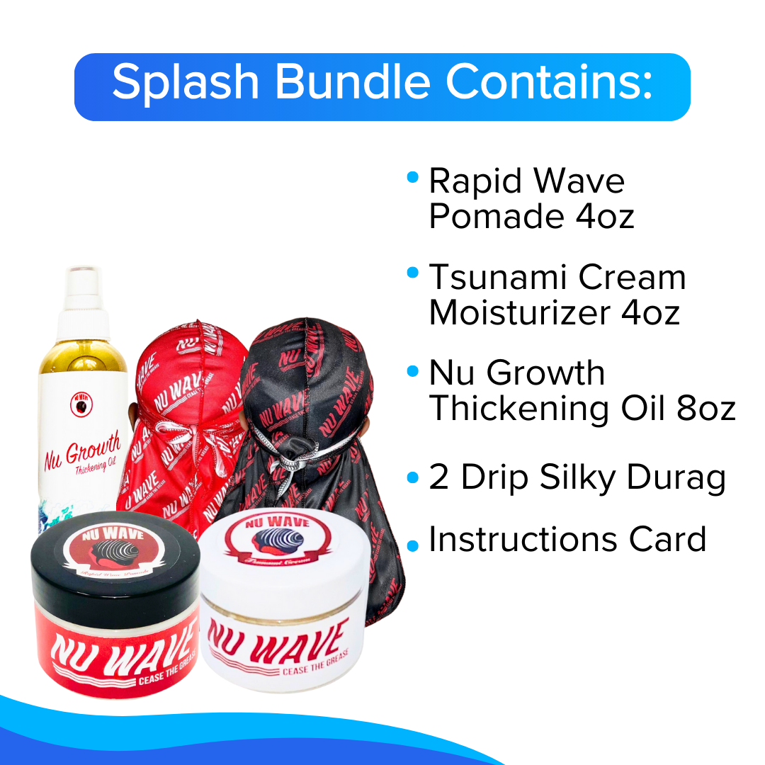 The Splash Bundle is an all-in-one hair care set that includes styling products (Rapid Wave Pomade), a moisturizer (Tsunami Cream Moisturizer), a growth oil (Nu Growth Thickening Oil), and two durags to maintain hairstyles and promote wave formation.