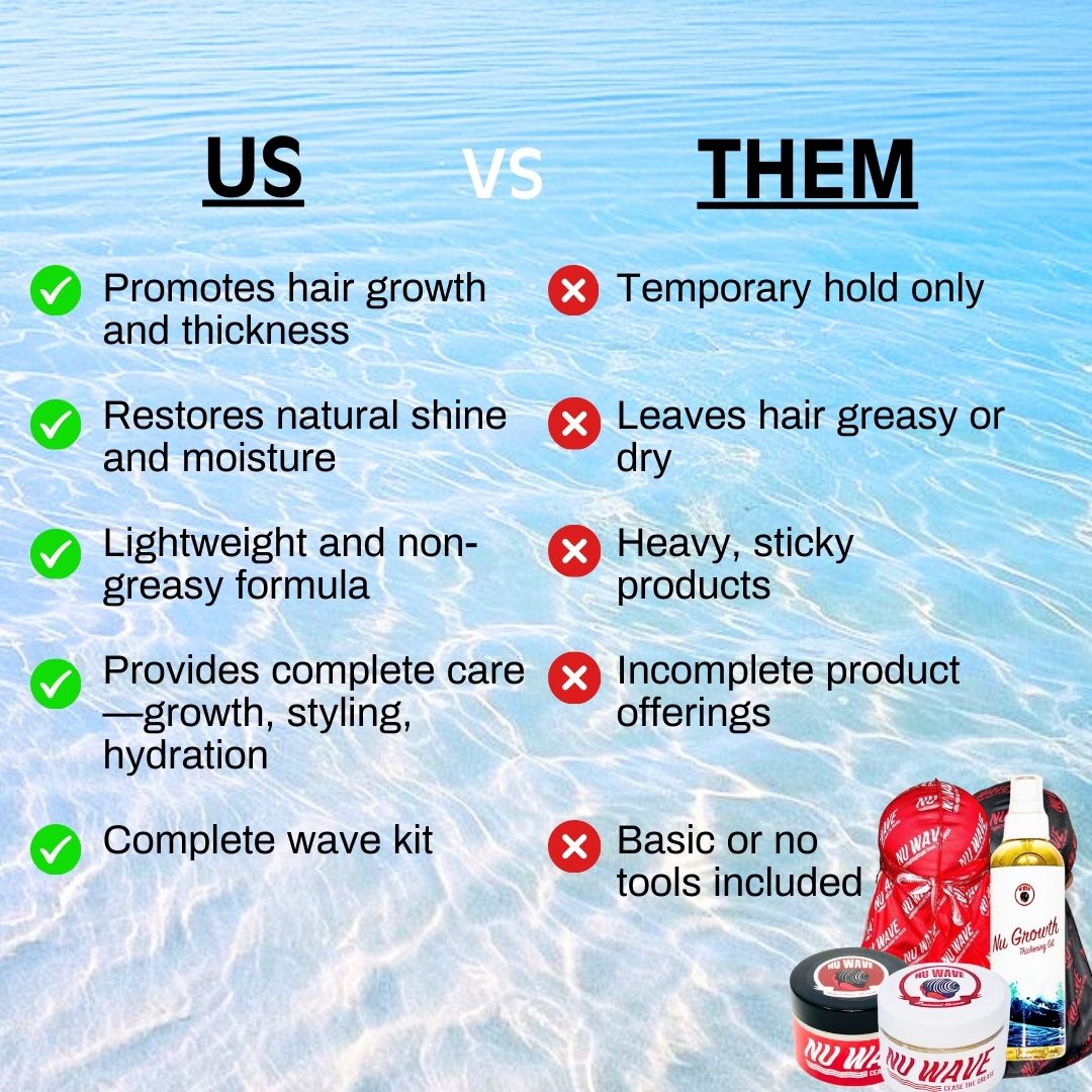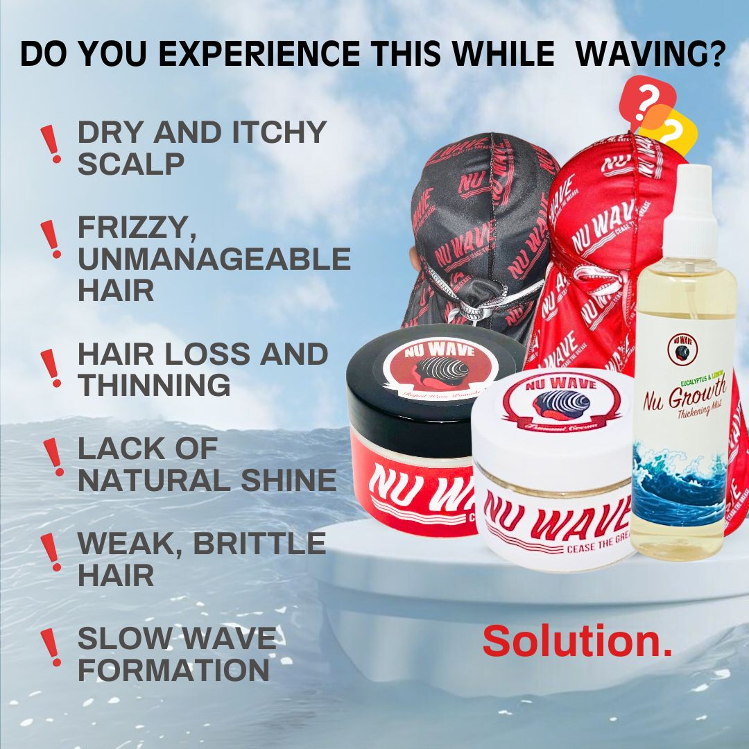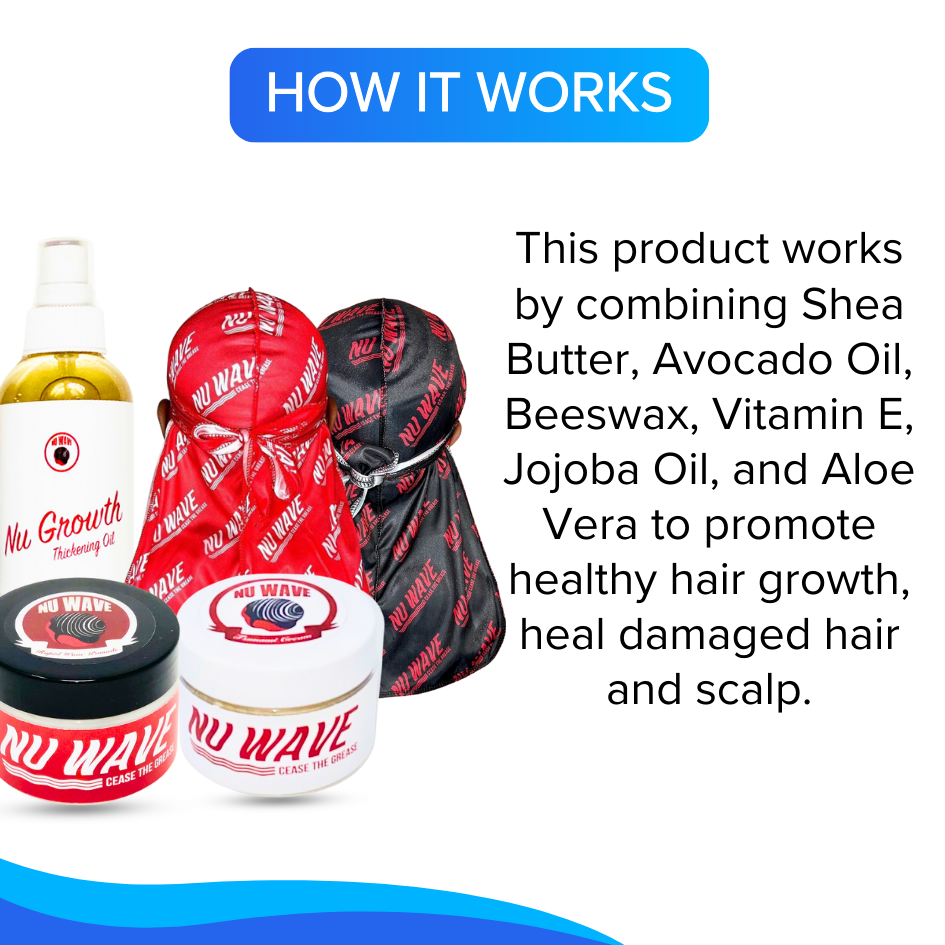 The Splash Bundle is an all-in-one hair care set that includes styling products (Rapid Wave Pomade), a moisturizer (Tsunami Cream Moisturizer), a growth oil (Nu Growth Thickening Oil), and two durags to maintain hairstyles and promote wave formation.