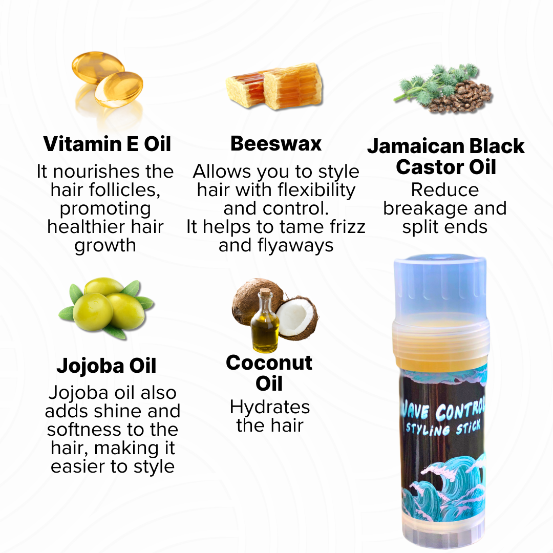The 'Wave Control Styling Stick" creates a slick silky texture with a flexible hold and shine for styling. Great for wolfing, baby hair, ponytails and overall laying hair down. Benefits: Reduces frizz , Helps detail styles. Enhances waves, edges, spiky styles. Does not weigh hair down.